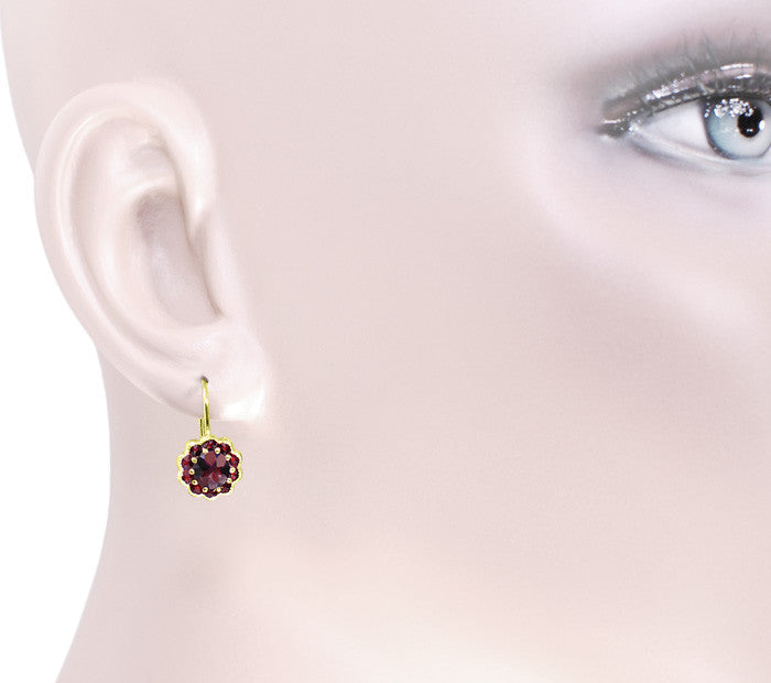 These gorgeous Victorian bohemian Garnet ( January Birthstone ) drop earrings showcase fiery red round rose cut natural garnets securely prong set in 14 karat yellow gold vermeil over sterling silver in the shape of a beautiful garnet flower, and measure 3/8 inch wide. These antique inspired earrings feature secure and comfortable lever back 14K solid gold earwires. A dazzling addition to a garnet lover's wardrobe, these wonderful earrings are sure to be cherished for generations to come.