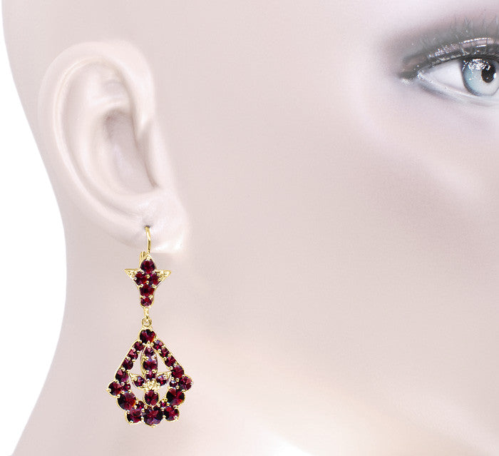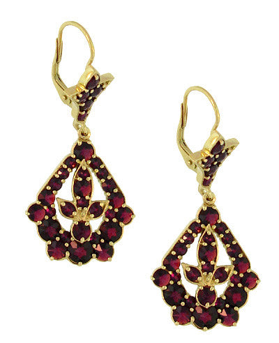 A shimmering garnet leaf is set atop a precious wreath of sparkling garnets that increase in size as the eye moves toward the bottom of the wreath. The total effect created by this design is pure enchantment! These regal original antique design red garnet earrings feature secure and comfortable lever back 14K solid yellow gold earwires and measure 1 9/16 inch high by 13/16 inch wide.