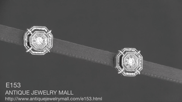 These classic vintage reproduction Art Deco stud diamond earrings measure 5/16 inch wide by 5/16 inch high by 1/8 inch deep and feature comfortable 18K butterfly backs with long notched posts for security.
