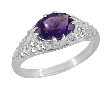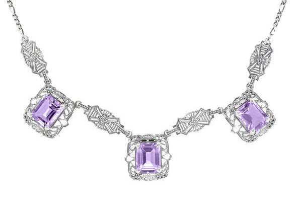 Measuring 5/8 inches high by 5/8 inch wide, they feature secure lockback earwires. These sterling silver filigree earrings feature a bright high polish anti-tarnish rhodium finish, making them a perfect coordinating match for white gold and platinum items in your jewelry collection. The classic vintage style of these exquisite Art Deco sterling silver amethyst earrings is sure to be admired.