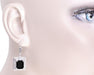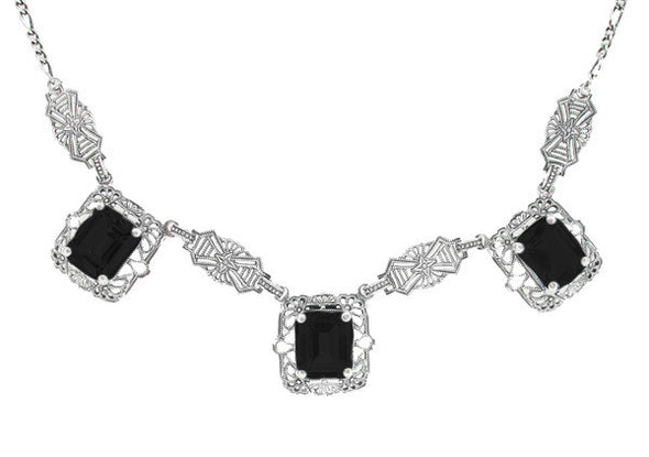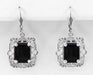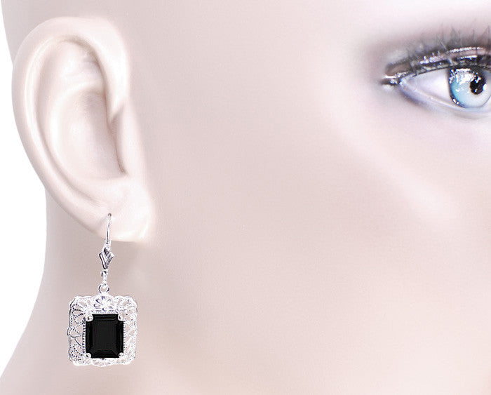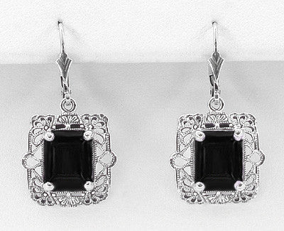 These lovely Art Deco filigree black onyx drop earrings in sterling silver feature a bold emerald cut natural black onyx gemstone at the center of each earring. The filigree framed onyx gemstones dangle from fleur-de-lis design accented earwires for eye catching movement, and are sure to be noticed.