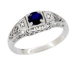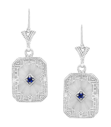 These romantic Art Deco earrings in sterling silver are sure to enchant you with all their delightful details! Elegantly framed by exquisitely rendered filigree work, each earring showcases an engraved frosted sunburst vintage camphor crystal which possesses at its heart a natural royal blue sapphire ( September Birthstone ) of 0.03 carat, securely four prong set in a diamond shaped silver frame. An arrowhead motif dangle top adds movement and further enhances the striking presentation, each set with a securely three prong set diamond of 0.005 carat.