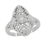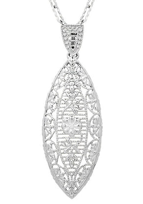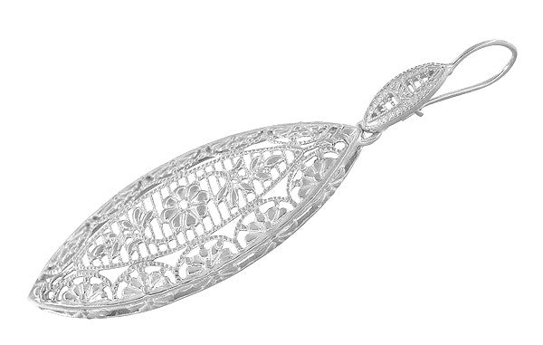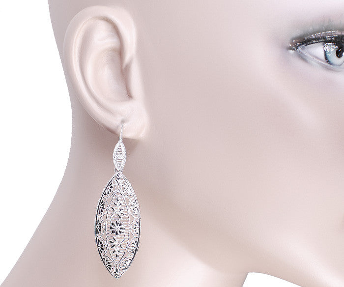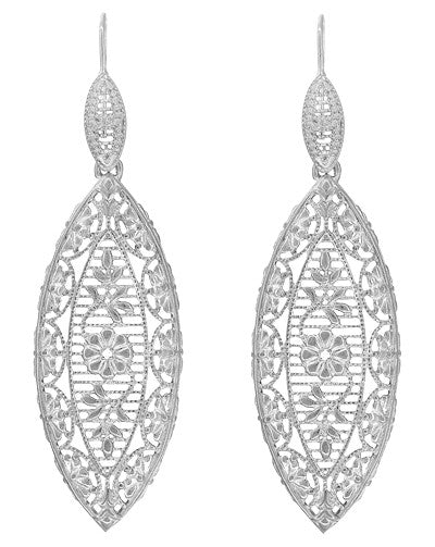 Hand crafted in sterling silver, these eye-catching Art Deco filigree earrings are finished in a bright high polish anti-tarnish rhodium finish, making them a perfect coordinating match for white gold and platinum items in your jewelry collection.
