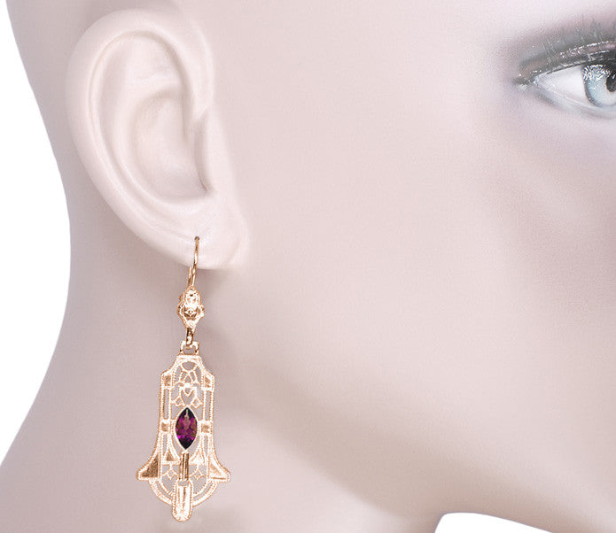 The body of each earring features a geometric filigree design with matte finish accents, set at the center with a lovely faceted marquise shape rose-red rhodolite garnet ( January Birthstone ), dangling from a meticulously detailed filigree top, for attractive eye-catching movement. The finished open gallery around the sides of the earrings with light scattering millgrain edging is the perfect finishing touch for these gorgeous Art Deco rose gold garnet earrings.