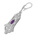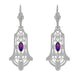 These 1920's design Art Deco filigree amethyst earrings are hand crafted in sterling silver with a bright high polish anti-tarnish white bright rhodium finish, making these earrings a perfect coordinating match for white gold and platinum items in your jewelry collection.