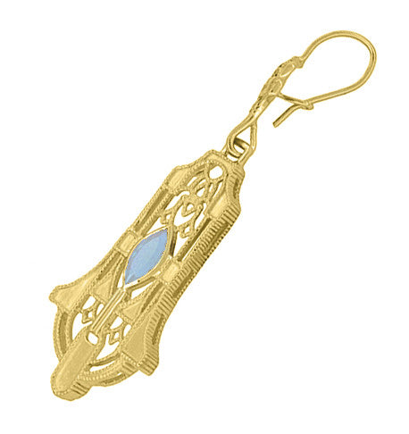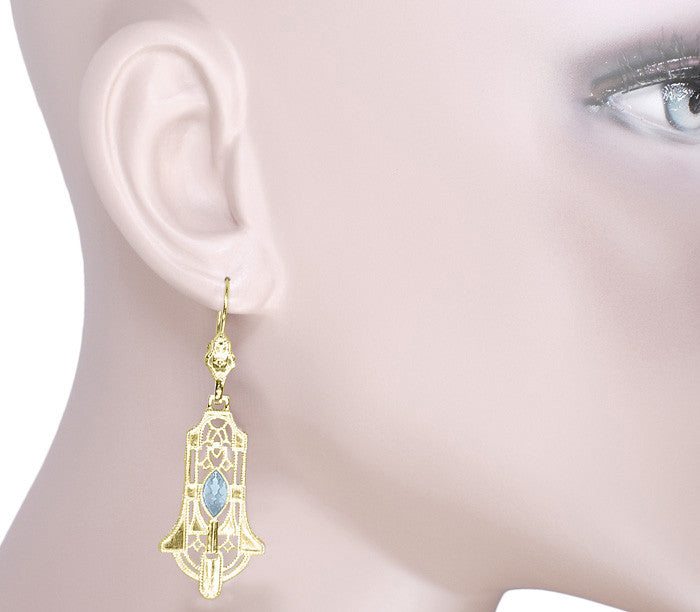 These vintage style Art Deco filigree earrings are hand crafted in sterling silver and finished in warm 18K yellow gold. The body of each earring features a geometric filigree design with matte finish accents, set at the center with a lovely faceted marquise shape natural sky blue topaz ( December Birthstone ), dangling from a meticulously detailed filigree top, for attractive eye-catching movement. The finished open gallery around the sides of the earrings and the light scattering millgrain edging with are the perfect finishing touch for these gorgeous Art Deco filigree blue topaz earrings.