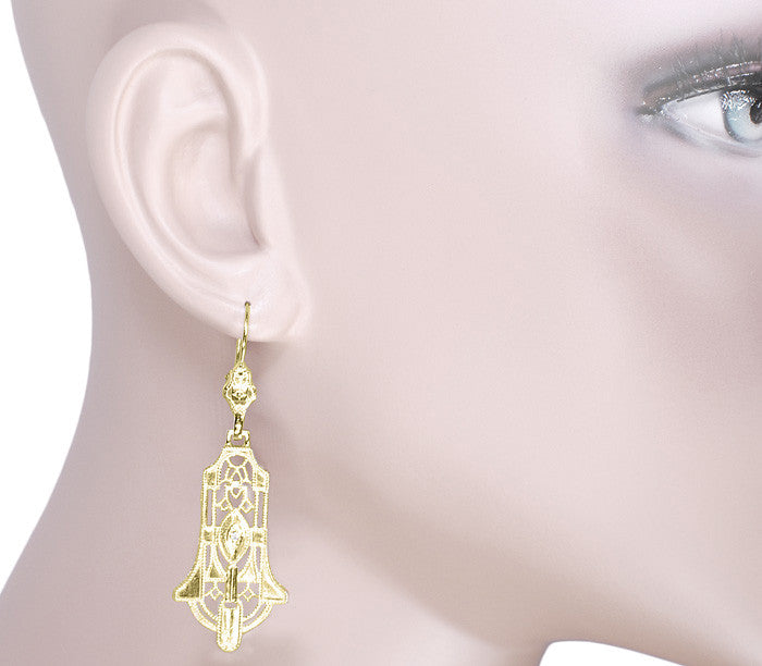 These classic Art Deco filigree earrings are hand crafted in sterling silver in sterling silver and finished in warm 18K yellow gold. The body of each earring features a geometric filigree design with matte finish accents, set with a 0.01 carat round brilliant cut diamond, dangling from a meticulously detailed filigree top, for attractive eye-catching movement. The finished open gallery around the sides of the earrings and the light scattering millgrain edging makes a perfect finishing touch for these timeless Art Deco earrings.