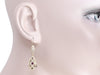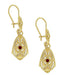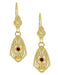 With secure lock back earwires, each earring measures 1 1/2 inches long from the top of the earwire to the bottom of the earring, by 1/2 inch wide. The detailed filigree openwork is the highlight of the design while also creating light-weight and comfortable dangling earrings. These Art Deco ruby earrings have a unique vintage style which is sure to be admired.