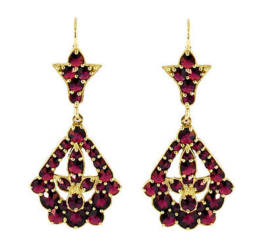 This large Victorian bohemian garnet floral bracelet in 18K yellow gold vermeil over sterling silver features 12 flowers of brilliant, fiery securely prong and bezel set rose cut natural pyrope garnets ( January Birthstone ) for an impressive total gem weight of 19.40 carats for the piece!