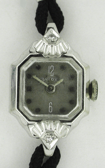 This lovely Bulova ladie's Art Deco wrist watch is fashioned in 14 karat white gold with its lugs set with two round diamonds for a total diamond weight of 0.02 carat. Featuring a precise 21 jewel movement, it has a gray silvered dial with round and square hour indexes and arabic numerals at 12 and 6 o'clock. The strap is black cord with a locking metal buckle for security.