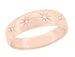 An exact reissue of an original 1950's Mid Century Modern men's vintage diamond wedding band in yellow gold, this time honored design features four shimmery diamonds embedded at the center of joyous carved starbursts. A smooth high polish finish completes the look.