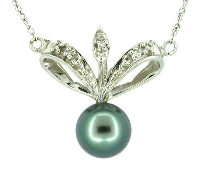 Timeless and elegant, this lovely vintage estate black pearl lavalier is a one of a kind classic. In a romantic bow knot motif, this Retro Moderne necklace, circa 1940's, is adorned with a gorgeous 8.7 millimeter cultured round black pearl (natural color) drop and set with three diamonds totaling 0.03 carat. Finely crafted in 14K white gold and measuring 18" inches long, this necklace is a treasure which will make you feel like a refined lady every time you wear it.