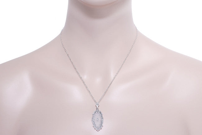 Refined and enchanting in its execution, this exquisite sterling silver Art Deco pendant necklace features lovely frosted crystal set with a sparkling 0.01 diamond, framed in beautiful meticulously detailed intricate sterling silver filigree. Measuring 1 1/4 inch high by 11/16 inch wide, this wonderful pendant comes with a classic 18 inch sterling silver link neckchain. This pendant would make an ideal gift for someone special - or for you!
