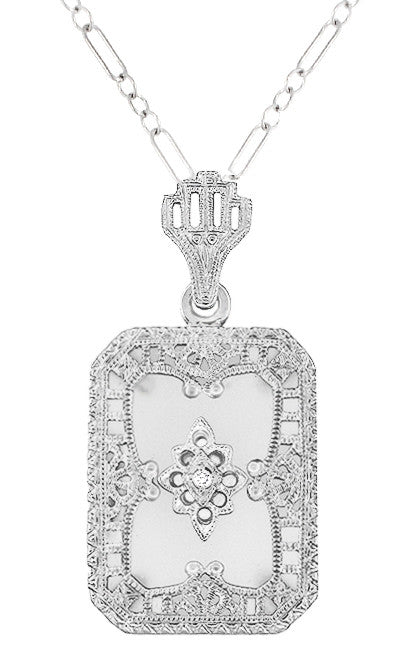 This 14K white gold Art Deco filigree diamond pendant necklace features an actual authentic circa 1920's translucent frosted camphor crystal with a white gold filigree floral setting at the center, set with a shimmering natural 0.01 carat diamond. Framed with a beautiful detailed engraved sterling 14K white gold frame, it measures 13/16 inch high by 5/8 inch wide. This wonderful vintage design white gold filigree pendant comes with a classic 18 inch sterling 14K white gold paper clip design neckchain.