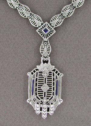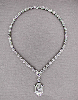 Art Deco Filigree Drop Pendant Necklace Set with Sapphire and Diamonds in Sterling Silver