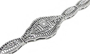 Truly reminiscent of days gone by, this stunning Art Deco filigree sapphire and diamond necklace is bezel set with a lovely square blue sapphire and three luminous round diamonds totaling 0.03 carat flanked by blue enameling. Meticulously hand finished in sterling silver filigree with an antique finish, even the refined links of this necklace are miniature sculptures to behold!