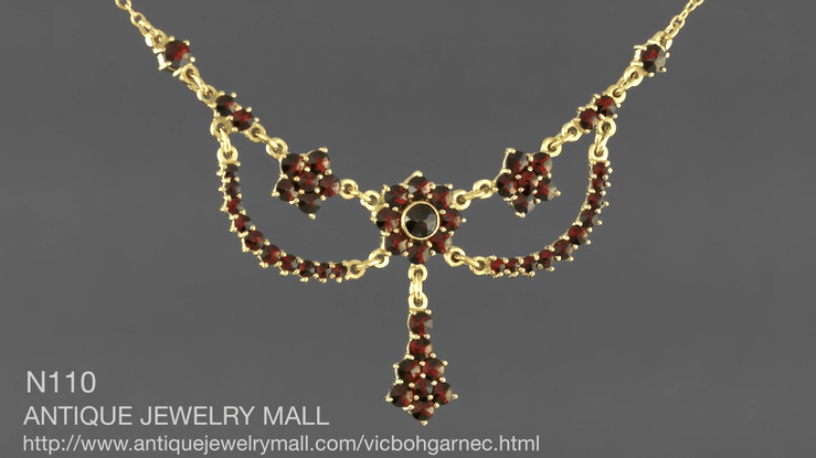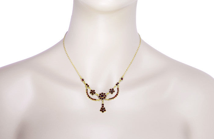 At its center is a stunning large garnet flower framed by two smaller garnet flowers underscored by lavish garnet swaths. A garnet set teardrop dangles from the large center flower, completing the elaborate presentation. Measures 16 inches. This exquisite necklace is perfect for a special occasion and should be on the wish list of any garnet lover!