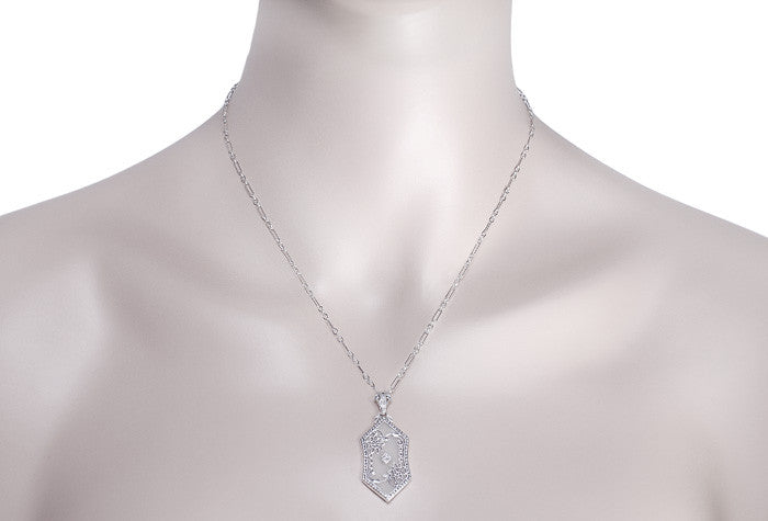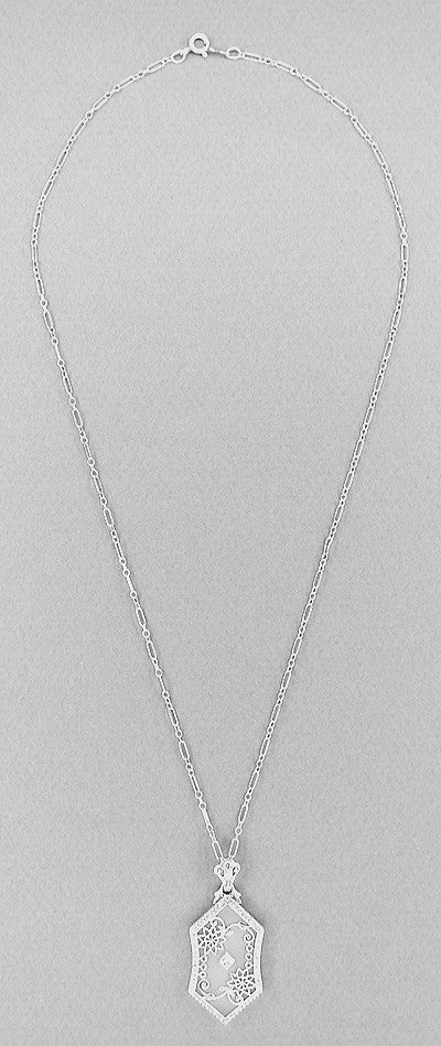 This pretty, feminine Art Deco filigree diamond pendant necklace in sterling silver is your special invitation to an enchanted garden! Framing the center diamond are brilliantly unfurled filigree blossoms, buds, and tendrils enhanced with millgrain edging for radiant effect.