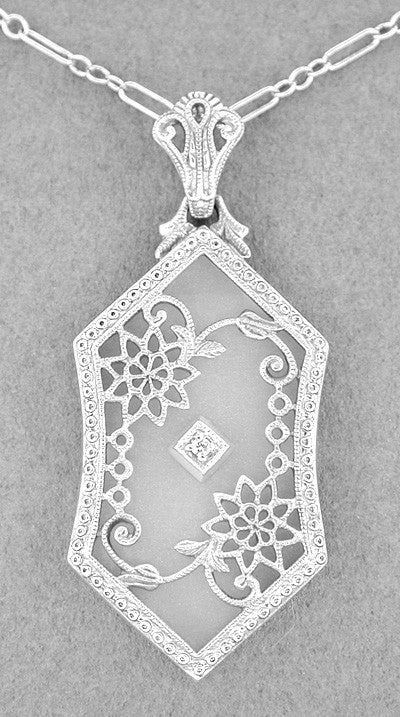 Art Deco Floral Filigree Camphor Crystal and Diamond Pendant Necklace in Sterling Silver