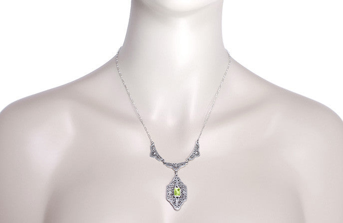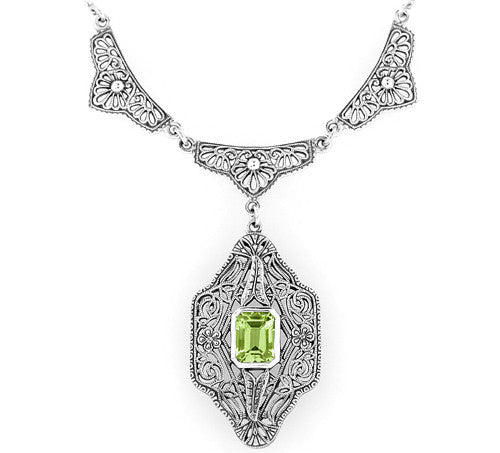 Art Deco Filigree Peridot Dangle Drop Pendant Necklace in Sterling Silver