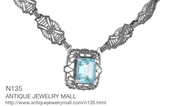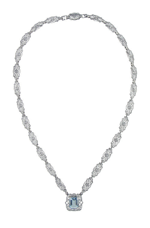 Art Deco Filigree Blue Topaz Drop Pendant Necklace in Sterling Silver