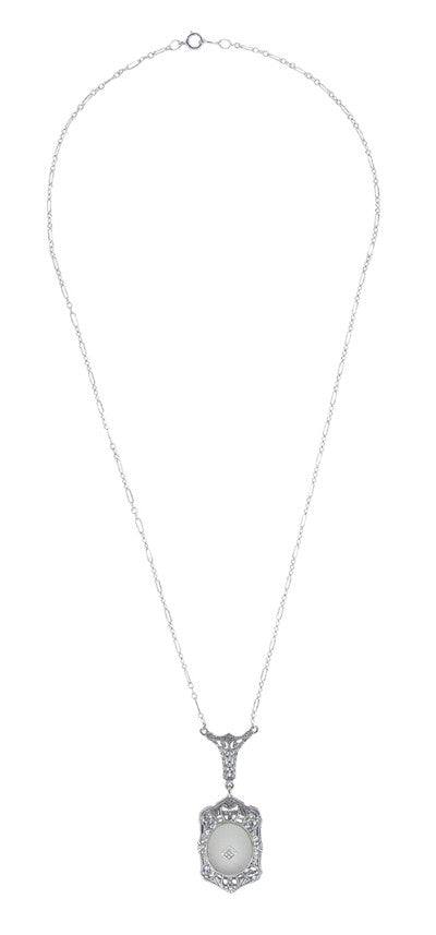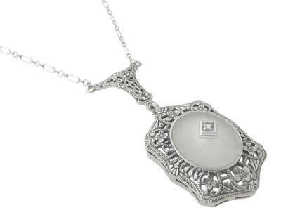 Filigree Art Deco Starburst Camphor Glass Crystal & Diamond Drop Pendant Necklace in Sterling Silver