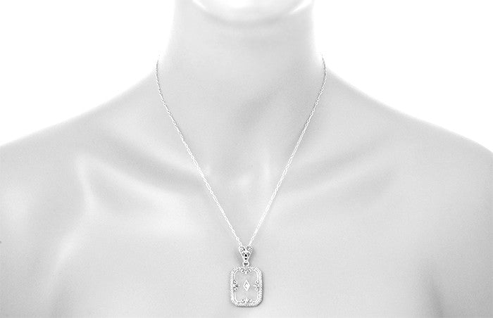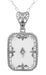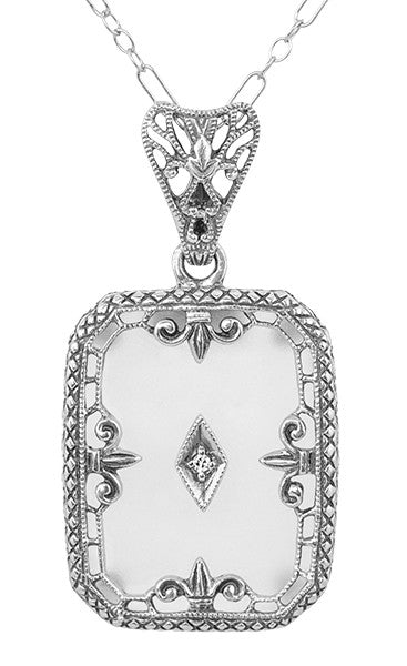 This romantic Art Deco camphor frosted crystal necklace in sterling silver features a center natural 0.01 diamond at its center, framed by a beautiful intricately detailed and engraved filigree fleur-de-lis design around the sides. Light scattering millgrain edging and a large ornate filigree bail are the perfect finishing touch for this lovely filigree heirloom pendant.