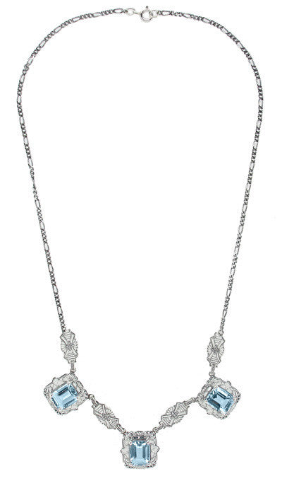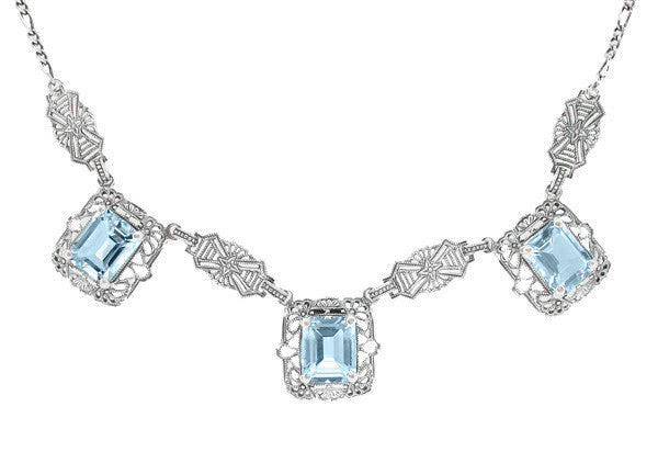 Art Deco Filigree Blue Topaz 3 Drop Necklace in Sterling Silver
