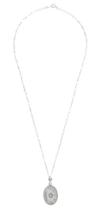 Art Deco Filigree Camphor Crystal and Diamond Oval Pendant Necklace in Sterling Silver