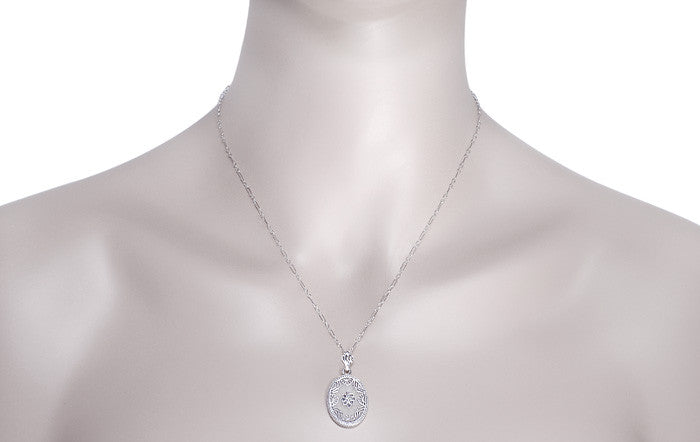This beautiful and graceful vintage Art Deco filigree sterling silver diamond pendant necklace design features a translucent frosted sun ray crystal oval framed with pretty floral and scroll filigree. From the heart of the romantic frosted camphor glass crystal shimmers a 0.01 carat round natural single cut diamond in a secure four prong setting. Radiant engraved chevrons and millgrain encircle the sides of the pendant with the ornate filigree bail provide an elegant finishing touch.