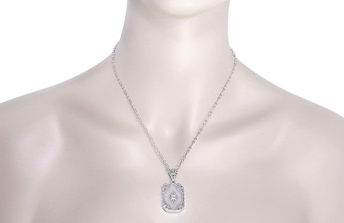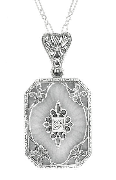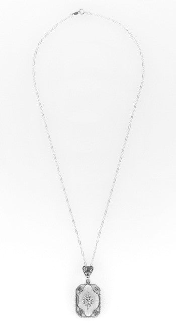Art Deco Filigree Scrolls Starburst Crystal and Diamond Pendant Necklace in Sterling Silver