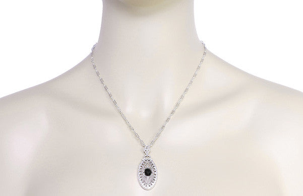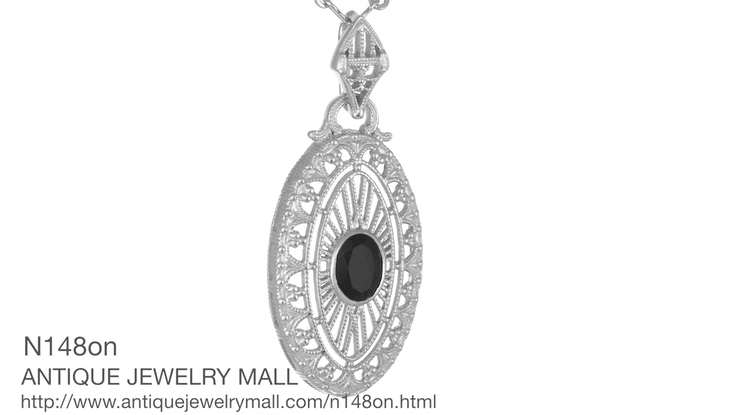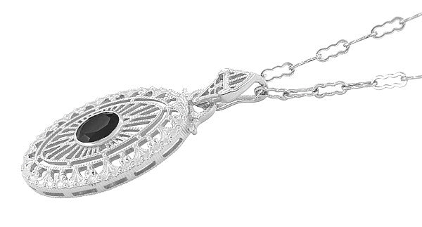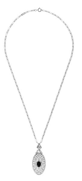 Hand crafted in solid sterling silver, this striking Art Deco black onyx necklace features a bright high polish anti-tarnish rhodium finish, making it a perfect coordinating match for white gold and platinum items in your jewelry collection. This wonderful antique onyx pendant necklace design is a faithful reproduction of an heirloom original from the 1920's, sure to be admired for a lifetime!