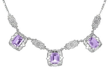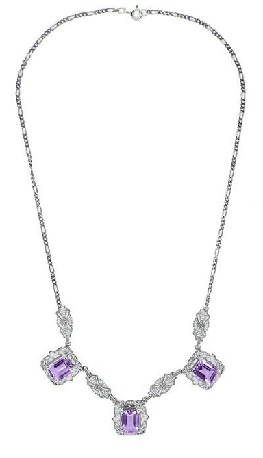 Hand crafted in solid sterling silver, this striking necklace features a bright high polish anti-tarnish rhodium finish, making it a perfect coordinating match for white gold and platinum items in your jewelry collection. This wonderful vintage design amethyst pendant is a faithful reproduction of an original from the 1920's with a timeless style that is sure to be admired for a lifetime.