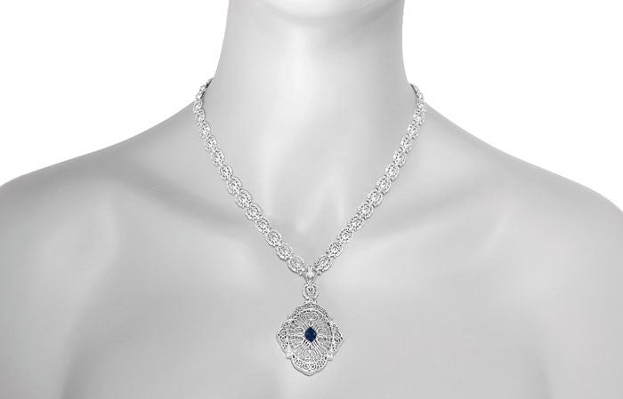 Edwardian Filigree Sapphire and Diamond Drop Pendant Necklace in Sterling Silver