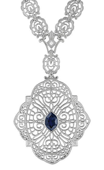 This substantial, unforgettable hand crafted sapphire pendant drop necklace features a bright high polish anti-tarnish rhodium finish, making it a perfect coordinating match for white gold and platinum items in your jewelry collection. An exact reproduction of an antique Edwardian original necklace circa 1910, the meticulous level of hand finished detail in this sapphire necklace is sure to be appreciated for generations.