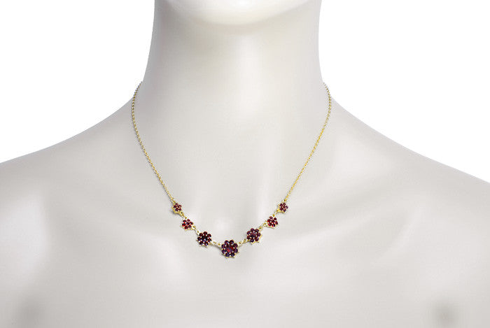 Victorian Bohemian Garnet Flowers Crescent Necklace in Sterling Silver with Yellow Gold Vermeil