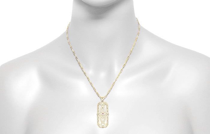 Art Deco Antique Inspired Filigree Ichthys Ruby Pendant Necklace in Yellow Gold Over Sterling Silver