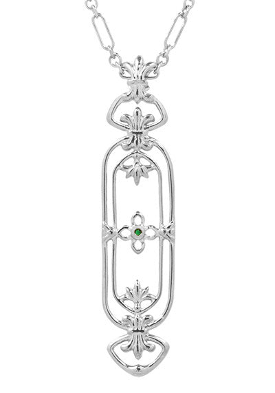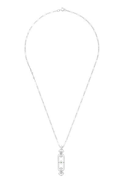 Measuring 2 inches high (including the bail) by 1/2 inch wide, this timeless Art Nouveau emerald pendant includes a coordinating vintage design 18-inch sterling silver neck chain.