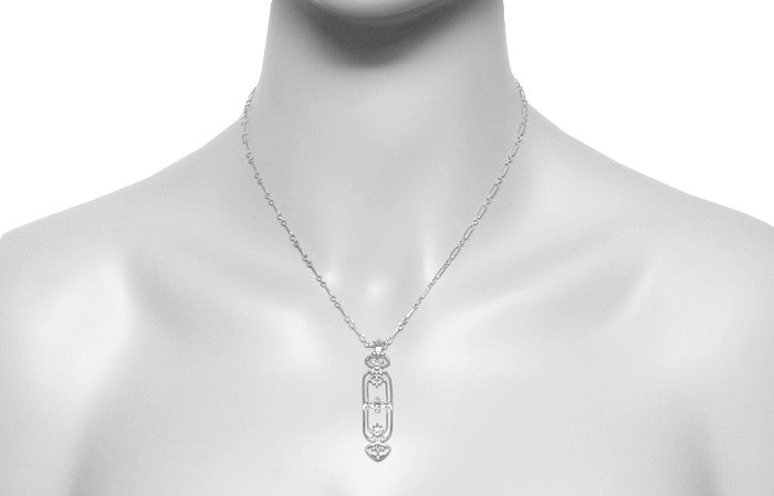 This graceful vintage reissue pendant necklace features a classic, elegant silver filigree open cartouche design with a natural red ruby at the center. The lovely delicate pendant design is complemented by an included 18" paper clip neckchain, and both the pendant and neckchain have a bright white high polish anti-tarnish rhodium finish for years of easy care.