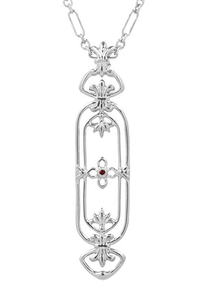 Filigree Art Nouveau Fleur De Lys Ruby Pendant Necklace in Sterling Silver