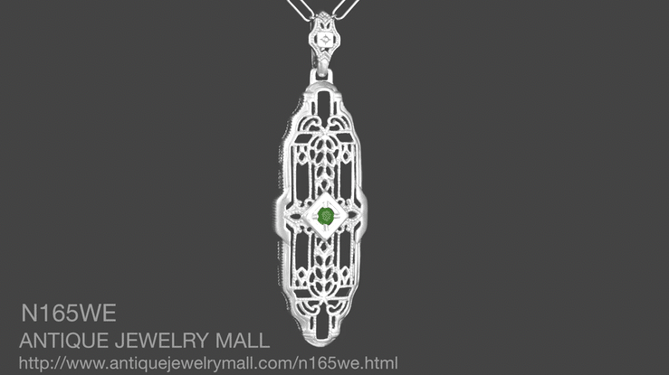 Measuring 2 1/4 inches high and 5/8 inch wide, this elegant artisan crafted 925 sterling silver vintage emerald pendant design includes a traditional antique style matching 18 inch sterling silver long and short paperclip neckchain. A high polish anti tarnish rhodium finish makes this beautiful heirloom emerald pendant necklace a perfect easy care fine jewelry choice for a lifetime of enjoyment.