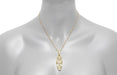 At 2.25 inches high, it has a substantial presence as it dangles from the coordinating vintage design 18 inch long sterling silver 18K yellow gold finished paperclip link neck chain.