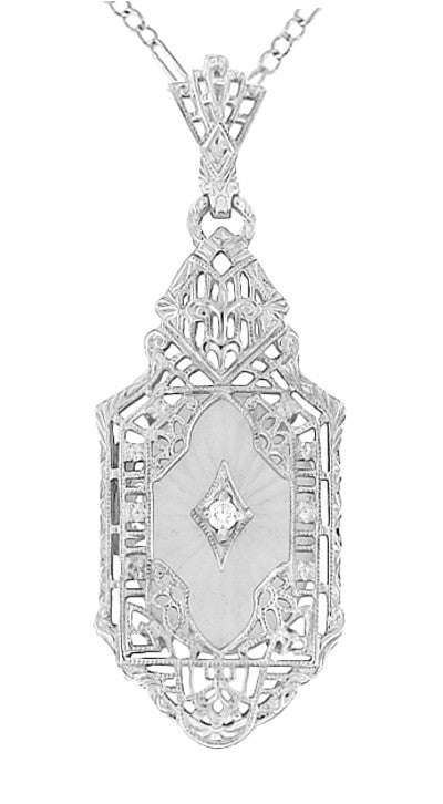 This elegant classic Art Deco lavalier pendant necklace features a lovely frosted starburst vintage camphor glass crystal set at the center with a shimmering round brilliant cut 0.01 carat natural diamond, framed in beautiful finely detailed intricate sterling silver filigree.