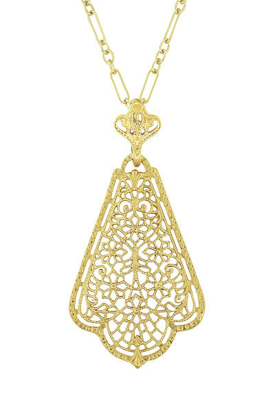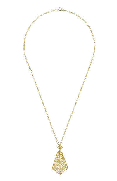 This unique yellow gold vermeil Edwardian filigree pendant necklace is hand crafted in 925 sterling silver and finished in 18K yellow gold. The scalloped body of the pendant is crafted in a detailed antique floral filigree design, dangling from a fleur-de-lis inspired scalloped top for attractive eye-catching movement. The finished open gallery around the side of this yellow gold finish pendant design completes the exquisite and thoroughly enchanting effect, with light scattering vintage millgrain edging and beadwork for the perfect finishing touch.