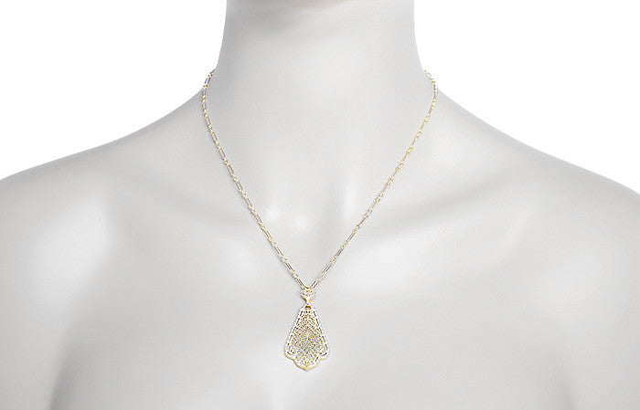 Edwardian Scalloped Leaf Dangling Filigree Pendant Necklace in Sterling Silver with Yellow Gold Vermeil