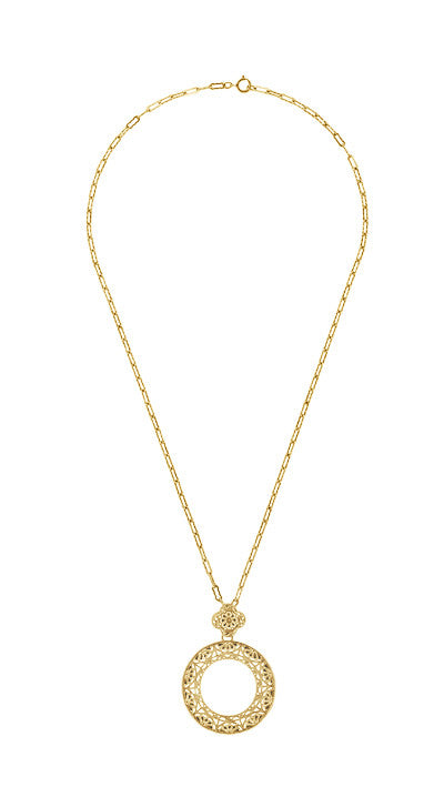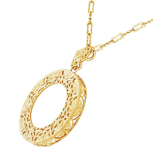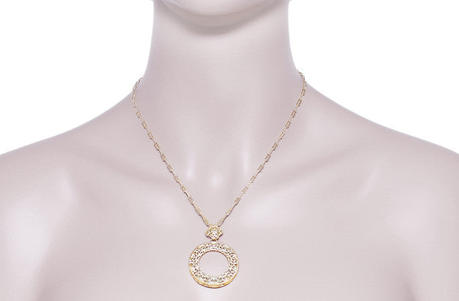 This beautiful Art Deco filigree pendant necklace is hand crafted in sterling silver and finished in warm 18K yellow gold, in a large circle motif as a symbol of eternal love and unity. Two tiers of detailed filigree floral scalloped design openwork, a finished open gallery around the sides of the pendant, and fine millgrain edging and beadwork for the perfect finishing touch create a substantial look which is sure to be noticed.