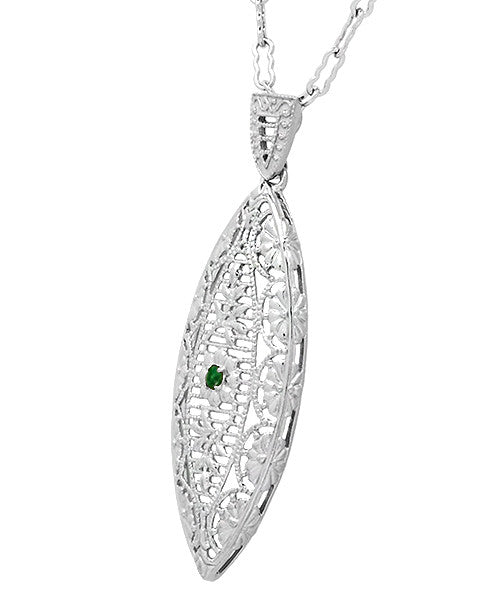 Delicate filigree flowers and leaves and nature inspired engraving lavishly decorate this beautiful 1920's leaf shaped emerald necklace in solid sterling silver. Artisan crafted from an original antique Art Deco emerald pendant design, it features a natural deep green emerald ( May Birthstone ) at the center of the leaf, accented with a lovely filigree border on the outside edges of the piece.