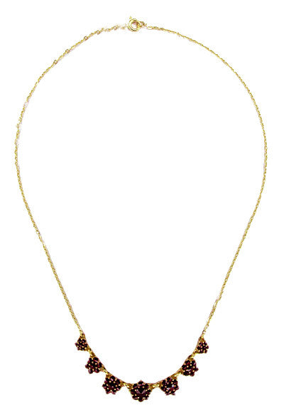This heirloom quality necklace showcases fiery red round rose cut natural bohemian garnets ( January Birthstone ) securely prong set in 18 karat yellow gold vermeil over sterling silver. A total of 7 lavish garnet flower clusters adorn the neckchain, creating an elaborate presentation.
