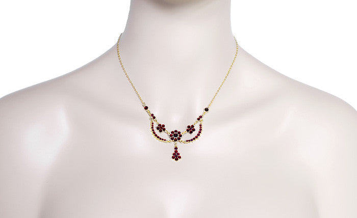 The center large garnet flower is framed by two smaller garnet flowers adorned with curved garnets set swaths. A garnet cluster drop dangles from the large center garnet flower, completing the elaborate presentation. Measures 16 inches.