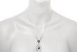 This timeless sterling silver vintage 1920's Art Deco drop pendant lavalier necklace design features an oval sunray engraved camphor crystal dangle drop with a dramatic oval black onyx center topped with a genuine natural single cut diamond of 0.01 carat in a square silver frame.